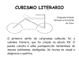 Origen: En la modernidad se dio con las vanguardias que buscaban la ruptura y la innovación a principios del siglo XX, y más concretamente con el cubismo literario; el cubismo, busca representar la esencia de la realidad mediante el uso de las formas geométrica, y los posteriores creacionismo y ultraísmo; el poeta cubista francés Guillaume Apollinaire fue un conocido creador de caligramas. El poeta creacionista chileno Vicente Huidobro ya había incluido su primer caligrama.